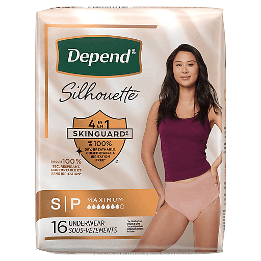 Take on bladder leaks with all-day trusted protection from Depend Silhouette Adult Incontinence and Postpartum Bladder Leak Underwear for Women. Featuring our best skin protection ever with unbeatable breathability, our disposable underwear is unlike bulky adult diapers. Depend Silhouette bladder leakage underwear is made with breathable, premium, cotton-like fabric and a super absorbent core that instantly absorbs leaks to help keep you fresh. With 4-in-1 SkinGuard, Depend women’s adult underwear is up to 100% dry, breathable, comfortable, and irritation-free by shielding from irritants in urine. Plus, our underwear has an ultra-soft liner designed to be gentle on skin and comfortable leg elastics to help prevent leaks. Our bladder leak underwear also wicks away heat and moisture to help keep your skin dry and is designed with soft shapewear fabric that conforms to your body for invisible comfort and glides against skin to help prevent irritation. With a discreet fit that is unnoticeable under clothes for all-day confidence and trusted protection, you can look as great as you feel. Find your perfect look with four sizes—small (26-34" waist), medium (32-42" waist), large (40-52" waist) or extra-large (50-60" waist)—and in a stylish pink color. Depend incontinence products are HSA/FSA-eligible in the US.